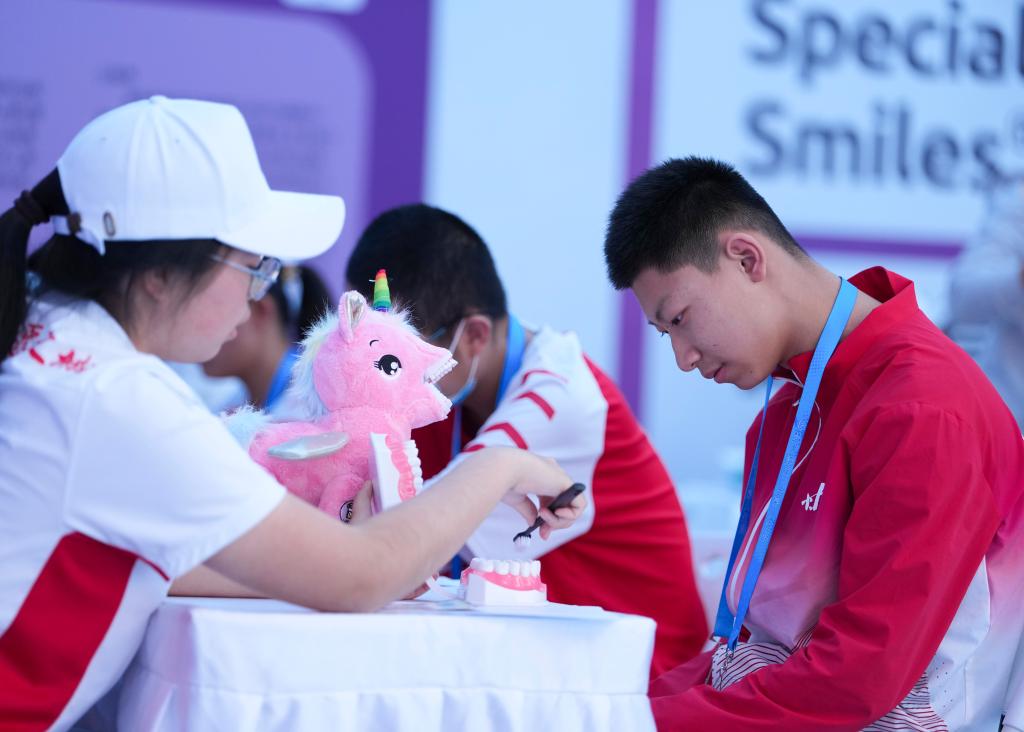 12月8日,在廣東省中山市體育館副館,工作人員為特奧運(yùn)動員普及護(hù)齒知識。新華社記者 楊晨光 攝